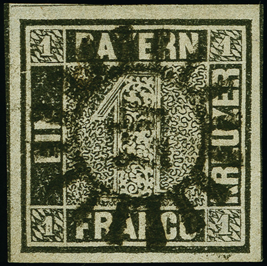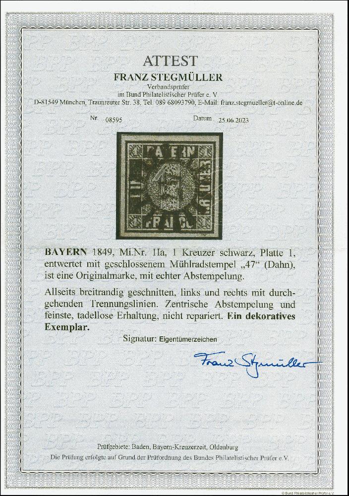 | Zusatzinformationen und Suchstichworte: | 382. Auktion Heinrich Köhler 18. – 23. September 2023 Los 3718 1 Kr. schwarz, Platte 1, farbfrisch und allseits breitrandig, links und rechts voller und Zwischenlinie, mit sehr klarem Mühlradstempel "47" von Dahn, tadellos, sehr schönes Exemplar, signiert und Fotoattest Stegmüller BPP (2023) Ausruf 800,00 EUR |