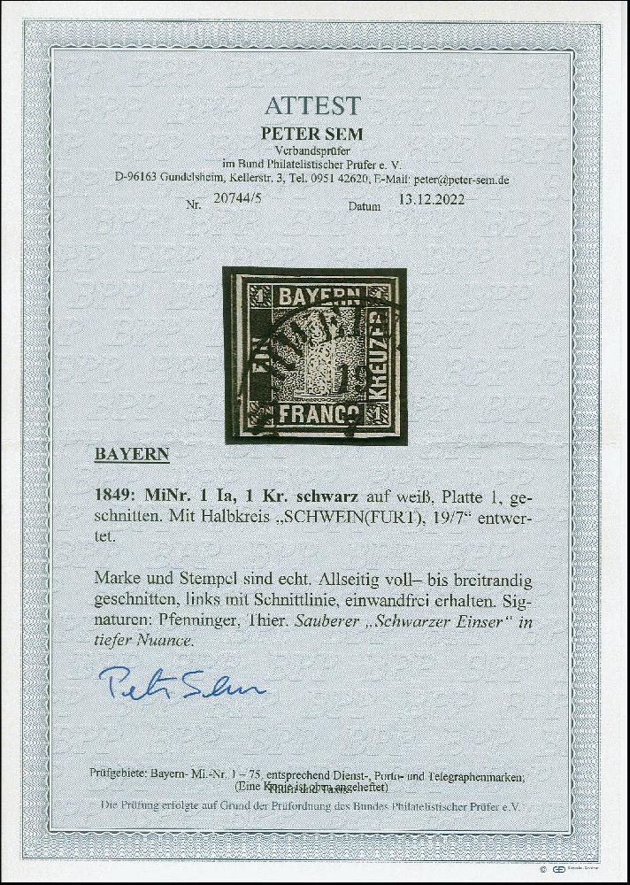 | Zusatzinformationen und Suchstichworte: | 382. Auktion Heinrich Köhler 18. – 23. September 2023 Los 3719 1 Kr. schwarz, Platte 1, farbfrisch und voll- bis breitrandig, sauber entwertet durch Halbkreisstempel "SCHWEINFURT 19/7", einwandfrei, signiert Pfenninger und Thier, Fotoattest Sem BPP (2022) Ausruf 800,00 EUR |