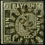 | Zusatzinformationen und Suchstichworte: | 382. Auktion Heinrich Köhler 18. – 23. September 2023 Los 3721 1 Kr. grauschwarz, Platte I, rechts leicht berührt, sonst noch voll- bis breitrandig, zentrisch entwertet mit auf dieser Marke sehr seltenem gMR “324” Spalt, sonst einwandfrei. Fotobefund Sem BPP (1998) Ausruf 500,00 EUR |