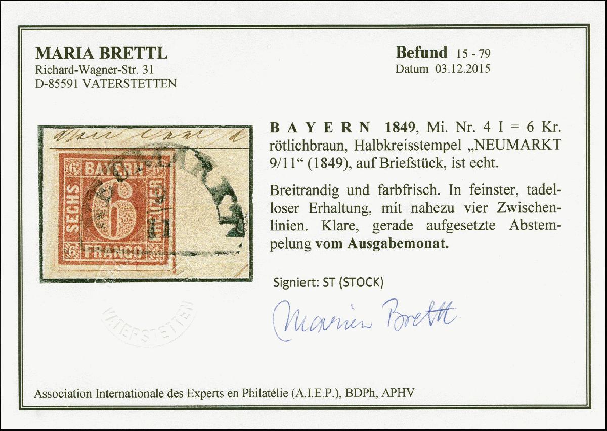 | Zusatzinformationen und Suchstichworte: | 382. Auktion Heinrich Köhler 18. – 23. September 2023 Los 3738 6 Kr. braunorange, farbfrisch und allseits breitrandig, mit vollen Zwischenlinien an 3 Seiten, mit sauber aufgesetztem Halbkreisstempel "NEUMARKT 9/11" auf Briefstück. Ein schönes und tadellose Stück mit sehr frühem Datum. Signiert Stock und Fotobefund Brettl (2015) Ausruf 150,00 EUR |