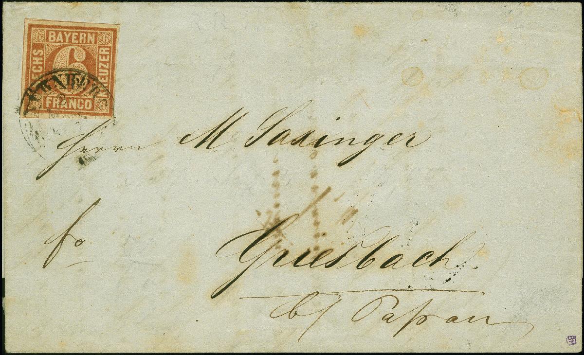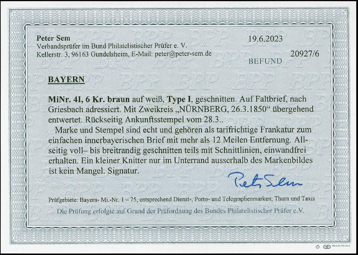 | Zusatzinformationen und Suchstichworte: | 382. Auktion Heinrich Köhler 18. – 23. September 2023 Los 3740 6 Kr. braunorange, farbfrisch und voll- bis breitrandig, mit DKr. "NÜRNBERG 26 MAR 1850" auf komplettem Faltbrief nach Griesbach. Einwandfrei (geringer Knitter außerhalb des Markenbildes). Fotobefund Sem BPP (2023) Ausruf 200,00 EUR |