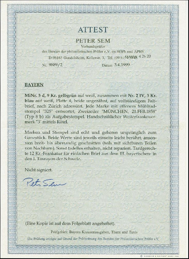 | Zusatzinformationen und Suchstichworte: | 382. Auktion Heinrich Köhler 18. – 23. September 2023 Los 3744 3 Kr. blau, Platte 4, und 9 Kr. gelbgrün, beide farbfrisch, einseitig jeweils leicht berührt, sonst breit- bis überrandig mit oMR "325" und nebengesetztem L2 "MÜNCHEN 21 FEB. 1858" auf komplettem Faltbrief nach Zürich mit 3 Kreuzern ausgewiesenem Weiterfranko. Ein attraktiver Auslandsbrief. Fotoattest Sem BPP (1999) Ausruf 150,00 EUR |