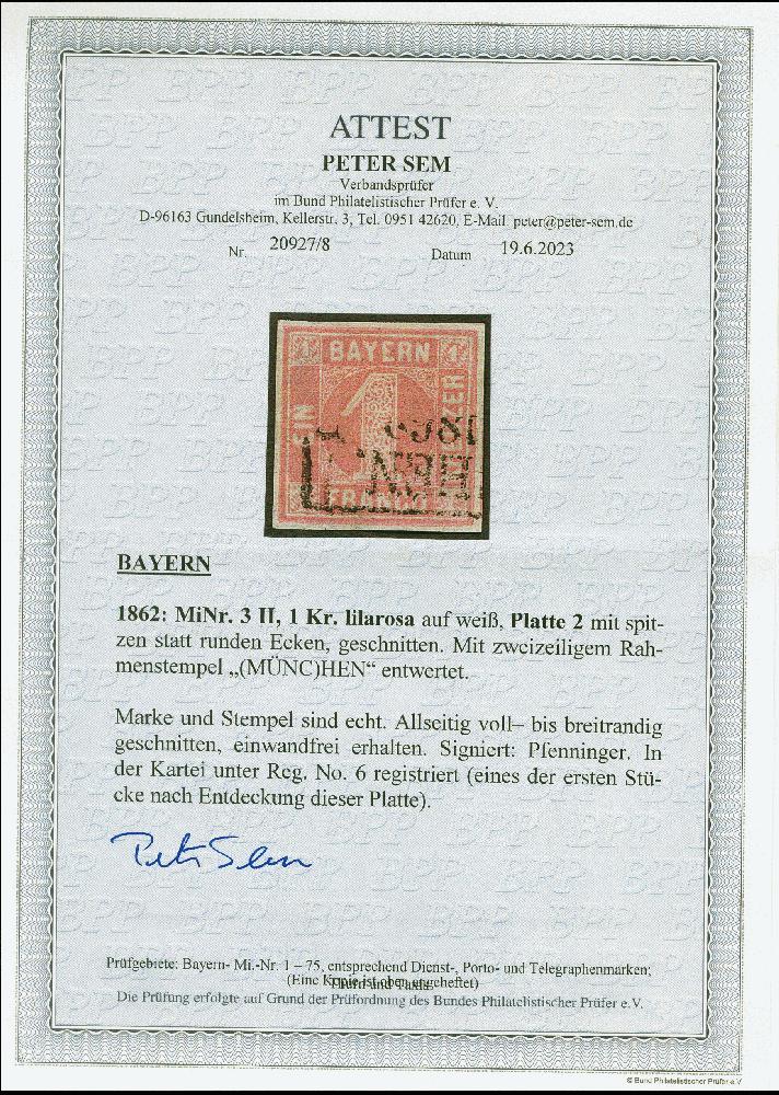| Zusatzinformationen und Suchstichworte: | 382. Auktion Heinrich Köhler 18. – 23. September 2023 Los 3747 1 Kr. lebhaftrosa, Platte 2, farbfrisch und voll- bis breitrandig mit Teilabschlag des Ra2 "MÜNCHEN" , tadellos, Fotoatteste Brettl BPP (1987) und Sem BPP (2023) Ausruf 700,00 EUR |