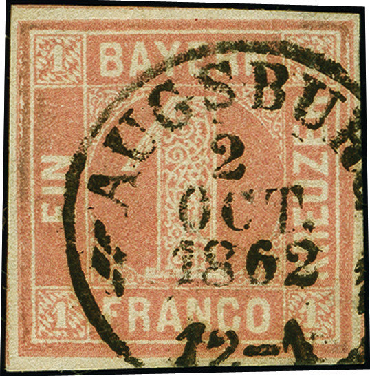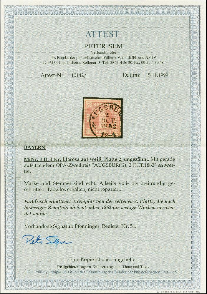 | Zusatzinformationen und Suchstichworte: | 382. Auktion Heinrich Köhler 18. – 23. September 2023 Los 3748 1 Kreuzer rosa, Platte 2, farbfrisch und voll- bis breitrandig, mit sauber aufgesetztem DKr. "AUGSBURG 2 OCT. 1862", tadellos. Ein schönes einwandfreies Stück dieser schwierigen und in einwandfreier Erhaltung sehr seltenen Marke. Signiert Pfenninger und Fotoattest Sem BPP (1999) Ausruf 600,00 EUR |