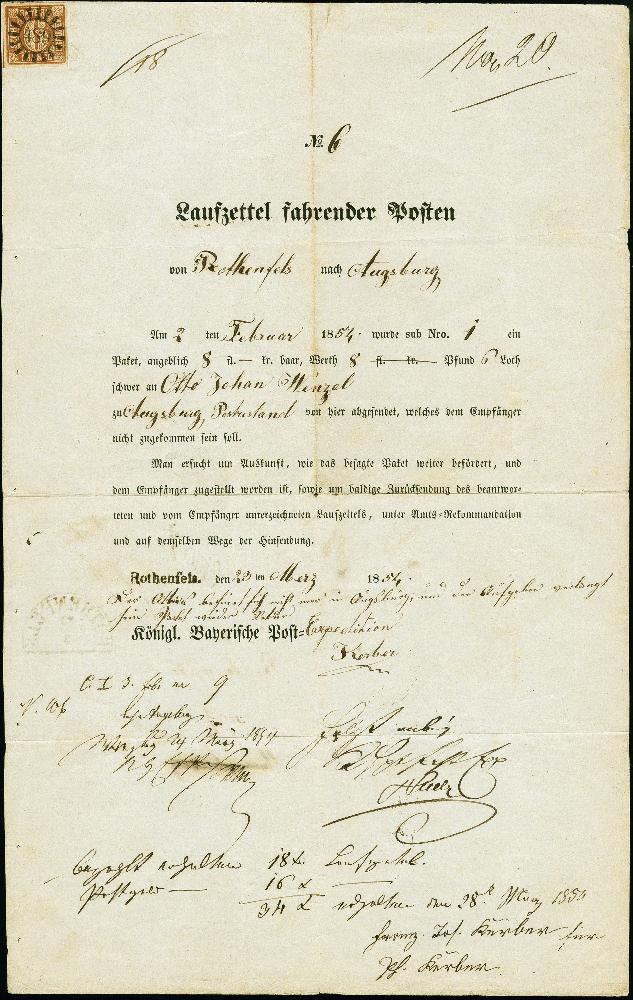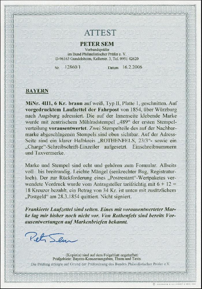 | Zusatzinformationen und Suchstichworte: | 382. Auktion Heinrich Köhler 18. – 23. September 2023 Los 3753 6 Kr. braun, farbfrisch und voll- bis breitrandig, mit Vorausentwertung durch zentrisch aufgesetztem gMR “489” ROTHENFELS, innenseitig auf “Laufzettel fahrender Posten” für ein Wertpaket von Rothenfels 1854 nach Augsburg. Die Marke archivbedingt leichte Bugspur und kleines Aufladungsloch, sonst einwandfrei.Ein sehr seltenes frankiertes Formular; mit Vorausentwertung haben wir kein weiteres registriert. Fotoattest Sem BPP (2006) Ausruf 1.500,00 EUR |