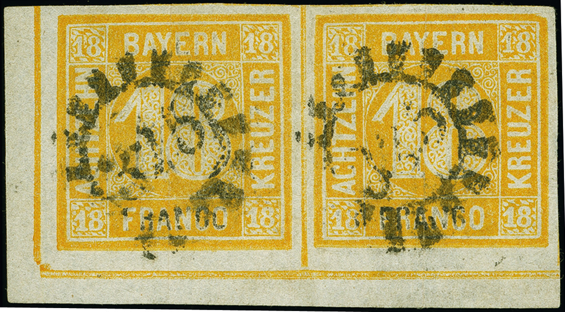 | Zusatzinformationen und Suchstichworte: | 382. Auktion Heinrich Köhler 18. – 23. September 2023 Los 3764 18 Kr. gelborange, waagerechtes Paar aus der linken unteren Bogenecke, farbfrisch und allseits breitrandig, mit ca. 3 mm Bogenrändern, sauber entwertet durch gMR "325". Schöne und tadellose Erhaltung. Ein Ausnahmestück. Signiert Pfenninger und Fotoattest Sem BPP (2023) Ausruf 500,00 EUR |