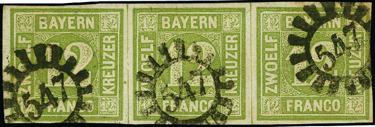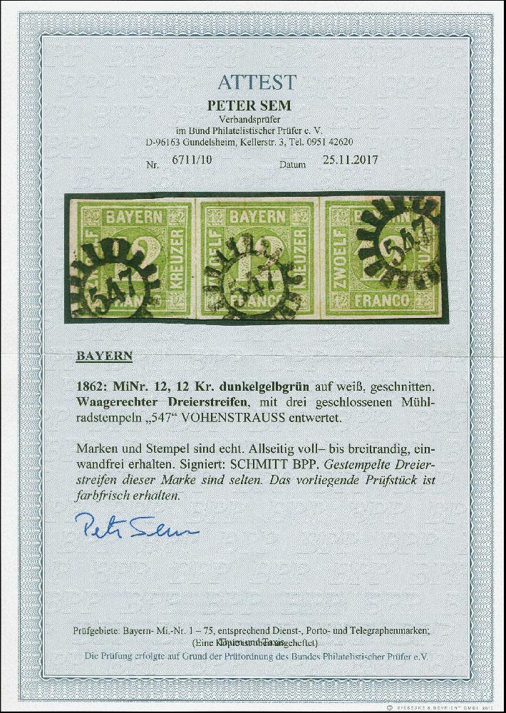 | Zusatzinformationen und Suchstichworte: | 382. Auktion Heinrich Köhler 18. – 23. September 2023 Los 3775 12 Kr. grün im waagerechten Dreierstreifen, voll- bis breitrandig und farbfrisch, sauber entwertet durch gMR "547" VOHENSTRAUSS, tadellos, eine sehr seltene und attraktive Einheit, sign. Schmitt BPP und Fotoattest Sem BPP (2017) Ausruf 400,00 EUR |