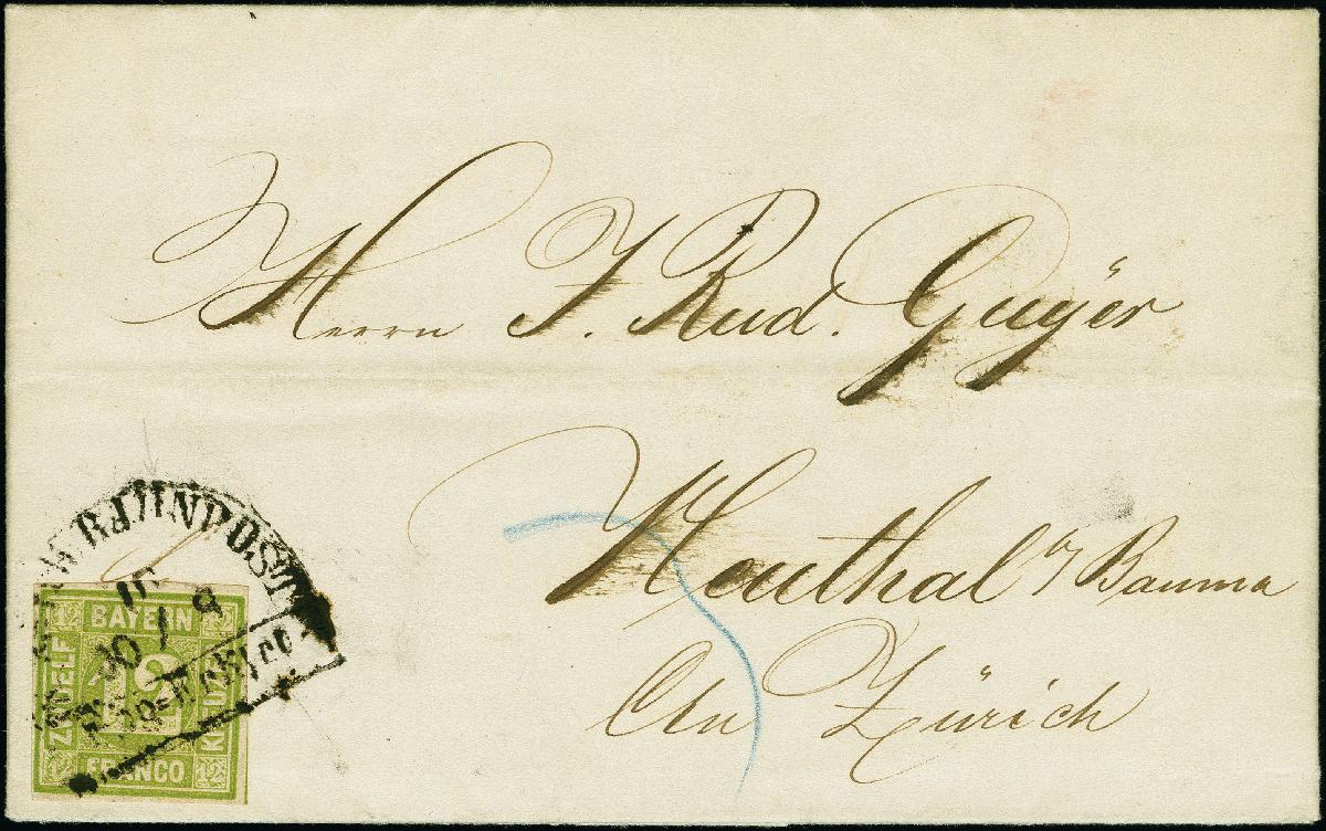 | Zusatzinformationen und Suchstichworte: | 382. Auktion Heinrich Köhler 18. – 23. September 2023 Los 3776 12 Kr. grün, farbfrisch und voll- bis breitrandig, mit sauber aufgesetztem Bahnpost-Halbkreisstempel "Nbg.-Frkfrt" 1866 auf komplettem kleinem Faltbrief in der Schweiz, mit 3 Kreuzern ausgewiesenem Weiterfranko. Frische und einwandfreie Erhaltung. Fotobefund Sem BPP Ausruf 200,00 EUR |