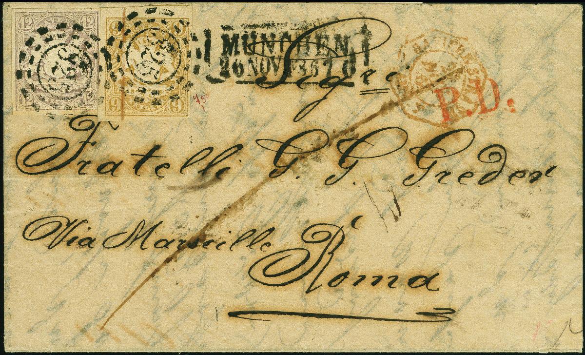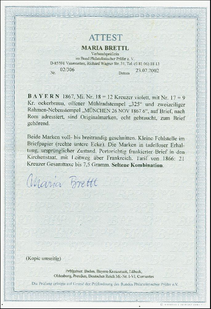 | Zusatzinformationen und Suchstichworte: | 382. Auktion Heinrich Köhler 18. – 23. September 2023 Los 3789 12 Kr. lila und 9 Kr. ockerbraun, beide voll- bis breitrandig und farbfrisch, mit oMR "325" und nebengesetztem Ra2 "MÜNCHEN 26 NOV. 1867" auf komplettem Faltbrief über Frankreich nach Rom, bezahlt bis zum Bestimmungsort. Eine seltene Frankaturkombination und seltener Leitweg, Fotoattest Brettl BPP (2002) Ausruf 800,00 EUR |