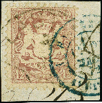 | Zusatzinformationen und Suchstichworte: | 382. Auktion Heinrich Köhler 18. – 23. September 2023 Los 3797 12 Kr. lila, farbfrisch und einwandfrei gezähnt, mit 'Doppelentwertung' durch Halbkreisstempel "LAUTRACH 20/3" und blauem französischen Grenzübergangsstempel, auf Briefstück. Tadellos. Signiert Pfenninger und Fotoattest Stegmüller BPP (2009) Ausruf 400,00 EUR |