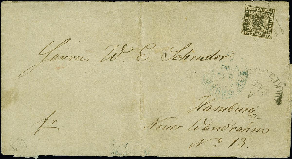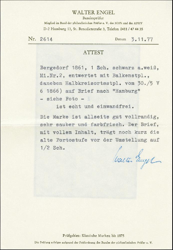 | Zusatzinformationen und Suchstichworte: | 382. Auktion Heinrich Köhler 18. – 23. September 2023 Los 3876 1 Sch. schwarz, rechts oben kurz berührt, sonst allseits voll- bis breitrandig mit sauberem Strichstempel und nebengesetztem "BERGEDORF 30/5" auf Faltbrief mit vollständigem Inhalt nach Hamburg mit Ankunftsstempel. Der Brief hat Alterungsspuren und Patina, sonst schöner und seltener Brief, handschriftliche Signatur Jakubek BPP mit Fotoattest (2001) und Fotoattest Engel BPP (1977) Ausruf 1.000,00 EUR |