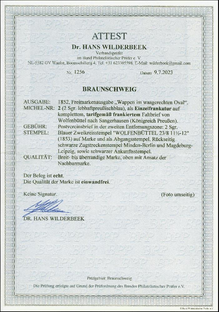 | Zusatzinformationen und Suchstichworte: | 382. Auktion Heinrich Köhler 18. – 23. September 2023 Los 3881 2 Sgr. lebhaftpreußischblau, farbfrisch und allseits breit- bis überrandig geschnitten, oben mit kleinem Teil der Nachbarmarke, sauber mit DKr. "WOLFENBÜTTEL 23/8" auf weißem Faltbrief nach Sangerhausen, tadellos, ein sehr frischer und attraktiver Brief, Fotoattest Wilderbeek BPP (2023) Ausruf 400,00 EUR |