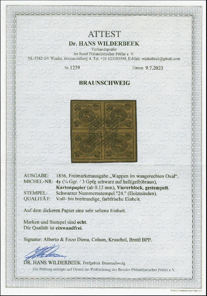 | Zusatzinformationen und Suchstichworte: | 382. Auktion Heinrich Köhler 18. – 23. September 2023 Los 3886 ¼ Ggr. auf hellgelbbraun auf dickem Kartonpapier im Viererblock, farbfrisch und allseits voll- bis breitrandig geschnitten, sauber mit fast zentrisch eingepasster Nummer "24" HOLZMINDEN entwertet, tadellos, das Wasserzeichen wie üblich etwas durchschlagend, eine sehr seltene und dekorative Einheit, u.a. sign. Diena, Colson und Brettl BPP sowie Fotoattest Dr. Wilderbeek BPP (2023) Ausruf 600,00 EUR |