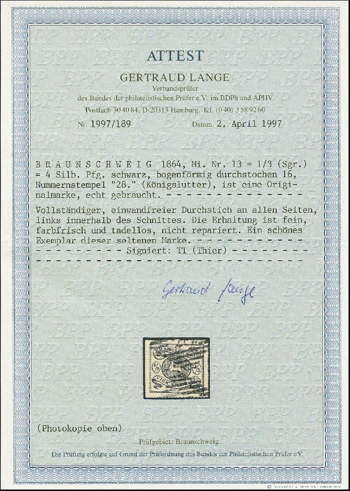 | Zusatzinformationen und Suchstichworte: | 382. Auktion Heinrich Köhler 18. – 23. September 2023 Los 3894 1864, Wappenausgabe durchstochen 1/3 Sgr. schwarz, farbfrisch und mit allseits gutem Durchstich, sauber entwertet durch Nr. "28" KÖNIGSLUTTER, tadellos, sign. Thier sowie Fotoattest Lange BPP (1997) Ausruf 600,00 EUR |