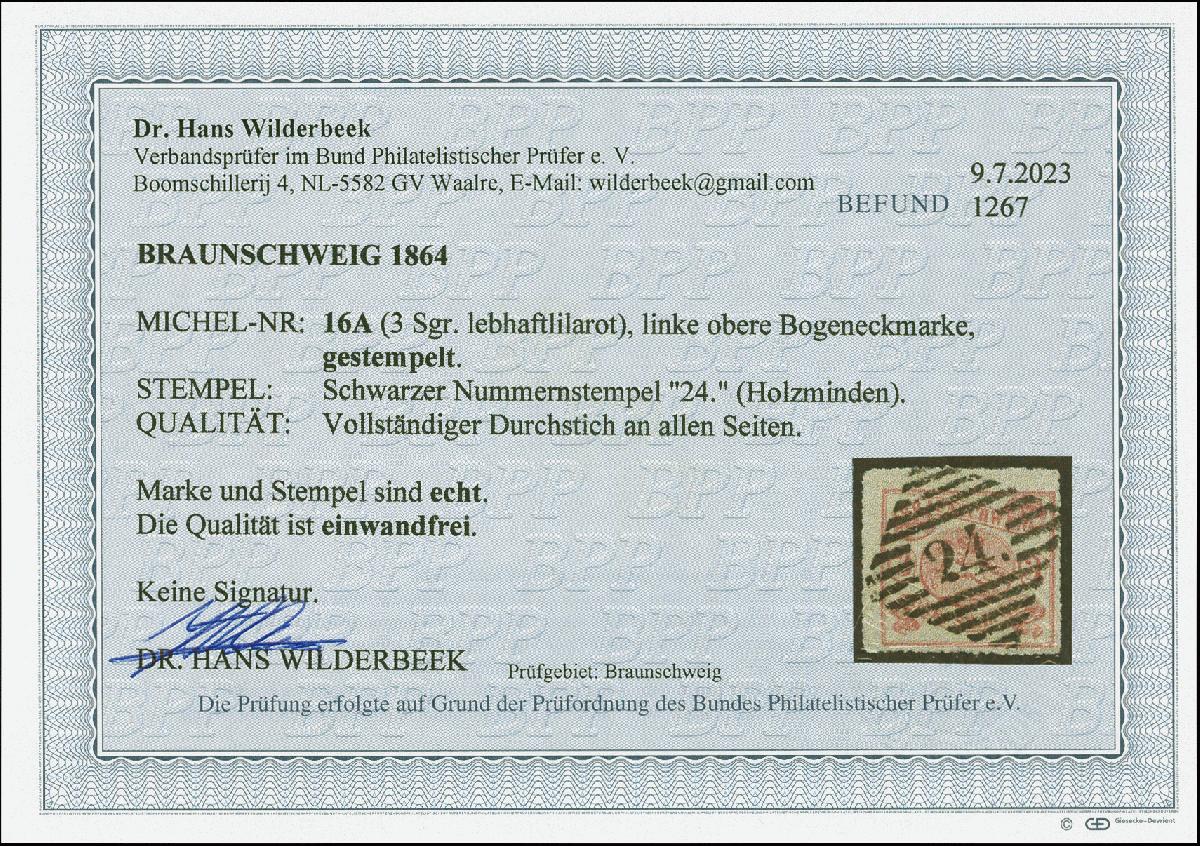 | Zusatzinformationen und Suchstichworte: | 382. Auktion Heinrich Köhler 18. – 23. September 2023 Los 3898 3 Sgr. lebhaftlilarot, farbfrisch und allseits gut durchstochen, sauber mit Nummer "24" HOLZMINDEN entwertet, tadellos, Befund Dr. Wilderbeek BPP (2023) Ausruf 120,00 EUR |