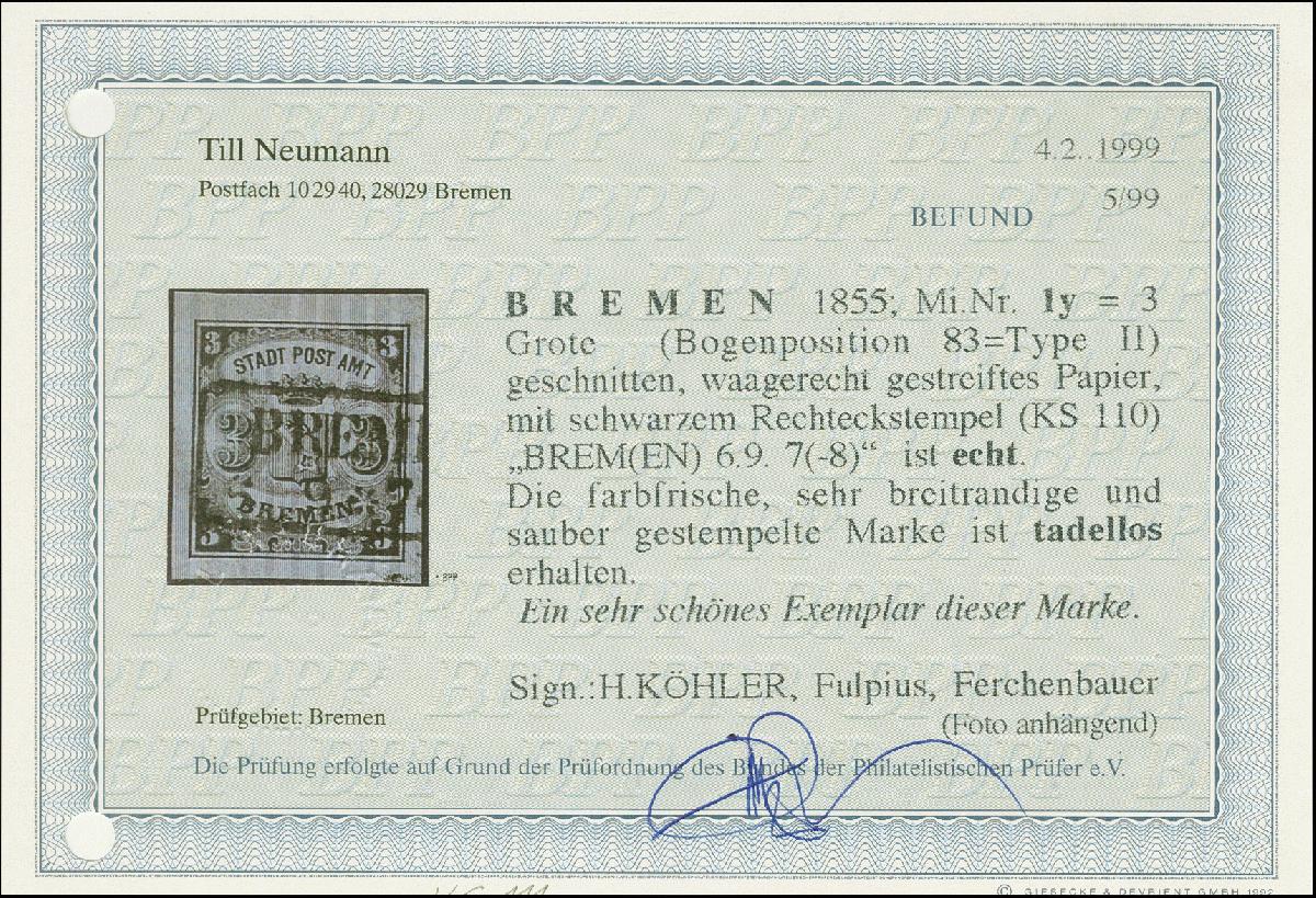 | Zusatzinformationen und Suchstichworte: | 382. Auktion Heinrich Köhler 18. – 23. September 2023 Los 3902 1855, 3 Gr. auf blaugrau (Bogenposition 83), waagerecht gestreiftes Papier, farbfrisch und allseits breitrandig geschnitten, sauber mit Ra2 "BREM(EN) 6 9 * 7" entwertet, ein tadellos und sehr schönes Exemplar dieser Marke, u.a. sign. Köhler und Fulpius sowie Befund Neumann BPP (1999) Ausruf 100,00 EUR |