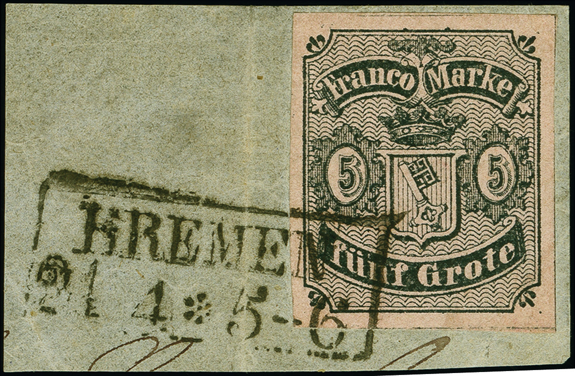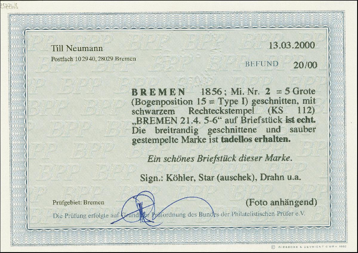 | Zusatzinformationen und Suchstichworte: | 382. Auktion Heinrich Köhler 18. – 23. September 2023 Los 3905 1856, 5 Gr. auf hellkarmingrau, sehr schön farbfrisch und allseits breitrandig geschnitten mit klarem Ra2 "BREMEN 21 4 * 5-6" auf Briefstück, ein schönes Briefstück dieser Marke, u.a. Köhler und Drahn sowie Befund Neumann BPP (2020) Ausruf 120,00 EUR |