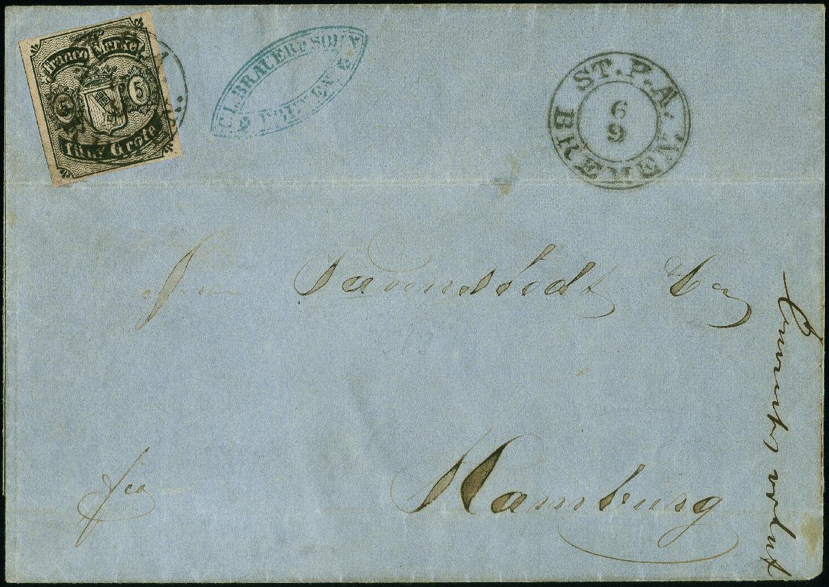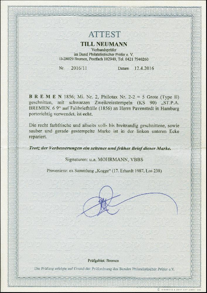 | Zusatzinformationen und Suchstichworte: | 382. Auktion Heinrich Köhler 18. – 23. September 2023 Los 3906 1856, Gr. a. hellkarmingrau, Type II, recht farbfrisch und allseits voll bis breit gerandet, mit sauber auf- und nebengesetzten DKr. "ST.P.A. BREMEN 6 9"(1856), auf Briefhülle nach Hamburg, mit rückseitigem Ankunftsstempel. Die äußere linke untere Ecke der Marke von Briefbug getroffen und repariert, sonst einwandfrei. Früher und seltener Brief. Signiert Mohrmann und VBBS , Fotoattest Neumann BPP (2016) Ausruf 600,00 EUR |