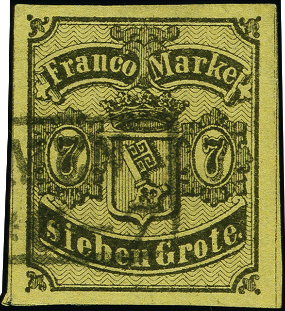 | Zusatzinformationen und Suchstichworte: | 382. Auktion Heinrich Köhler 18. – 23. September 2023 Los 3909 1860, 7 Gr. auf gelboliv, farbfrisch und allseits gleichmäßig breitrandig geschnitten, sauber und klar mit Ra2 "(BRE)MEN *6-7" entwertet, tadellos, ein sehr schönes Exemplar dieser Marke, sign. HK sowie W. Engel mit Fotoattest (1978) sowie Befund Neumann BPP (2012) Ausruf 250,00 EUR |