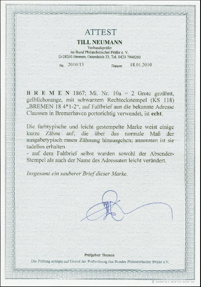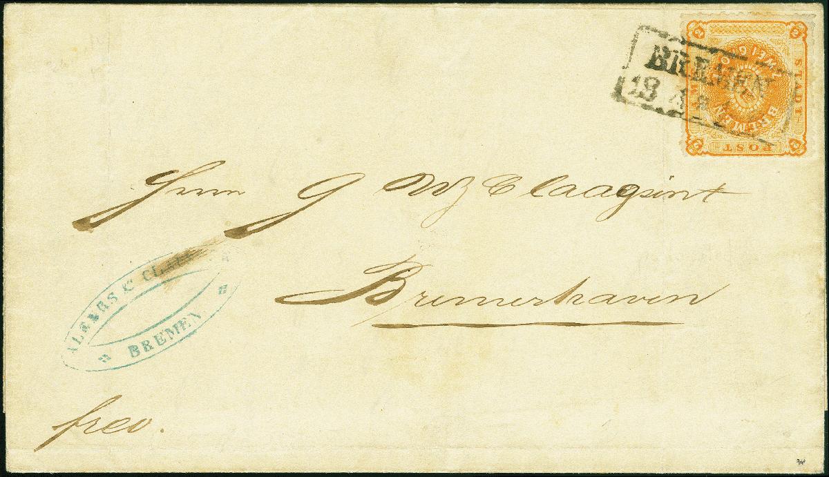 | Zusatzinformationen und Suchstichworte: | 382. Auktion Heinrich Köhler 18. – 23. September 2023 Los 3918 2 Grote gelblichorange, farbfrisch und bis auf einige kurze Zähne in einwandfreier Erhaltung, mit sauberem Ra2 "BREMEN 14 8" (1867) auf Faltbrief nach Bremerhaven mit Eingangsstempel; der Name in der Anschrift leicht abgeändert. Ein attraktiver Brief. Fotoattest Neumann BPP (2010) Ausruf 700,00 EUR |