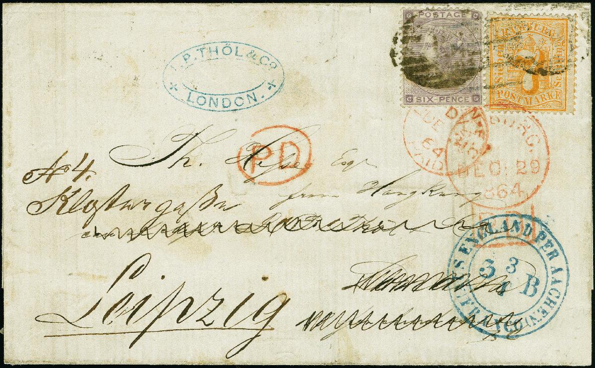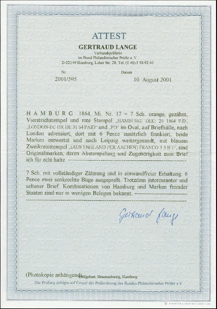 | Zusatzinformationen und Suchstichworte: | 382. Auktion Heinrich Köhler 18. – 23. September 2023 Los 3934 1864/67, 7 Schilling orange, farbfrisch und gut gezähnt, mit Balkenstempel auf Briefhülle an eine Forwarding-Adresse in London und von hier durch Forwarder "I.P. THÖL & Co." weitergesandt nach Leipzig, frankiert mit 1862/64, 6 P. lila, diese und die Hamburger Marke zusätzlich entwertet durch Ovalstempel, diverse Transitstempel. Die britische Marke 2 unauffällige senkrechte Büge und rechts oben eckrund. Eine selten und attraktive Nachsendefrankatur. Fotoattest Lange BPP Ausruf 2.000,00 EUR |