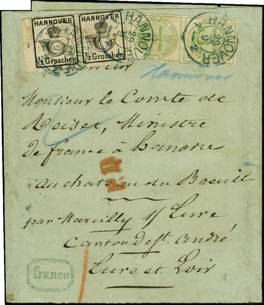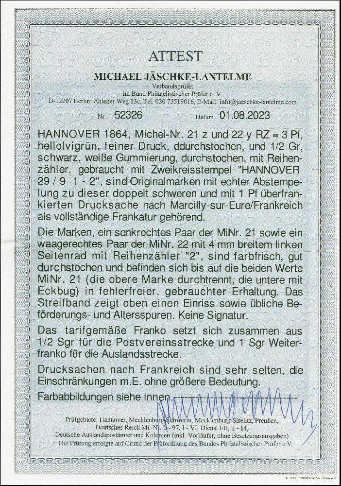 | Zusatzinformationen und Suchstichworte: | 382. Auktion Heinrich Köhler 18. – 23. September 2023 Los 4023 ½ Gr. schwarz, weißer Gummi, im waagerechten Randpaar, links mit Bogenrand und Reihenzähler "2", zusammen mit senkrechten Paar 3 Pfennig hellolivgrün, alle farbfrisch und gut durchstochen, mit blauem DKr. "HANNOVER 29/9" auf Drucksachenschleife der 2.Gewichtsstufe an die bekannte Adresse 'Comte de Reiset' nach Frankreich. Die obere 3 Pfennig wurde beim Öffnen des Streifbandes mit zerrissen; der Einriss unauffällig verklebt. Das Porto setzt sich zusammen aus ½ Sgr. Postvereinsporto und 1 Sgr. Weiterfranko (da nicht anders möglich 1 Pfg. überfrankiert). Eine attraktive und außerordentlich seltene Auslands-Drucksache in sonst einwandfreier Erhaltung. Fotoattest Jäschke-L. BPP (2023) Ausruf 1.000,00 EUR |