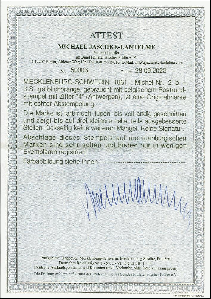 | Prüfer: | Jäschke-Lantelme, Michael (BPP (Bund Philatelistischer Prüfer)) |