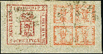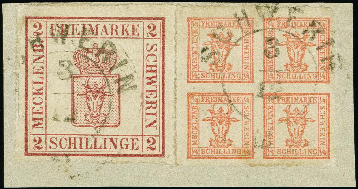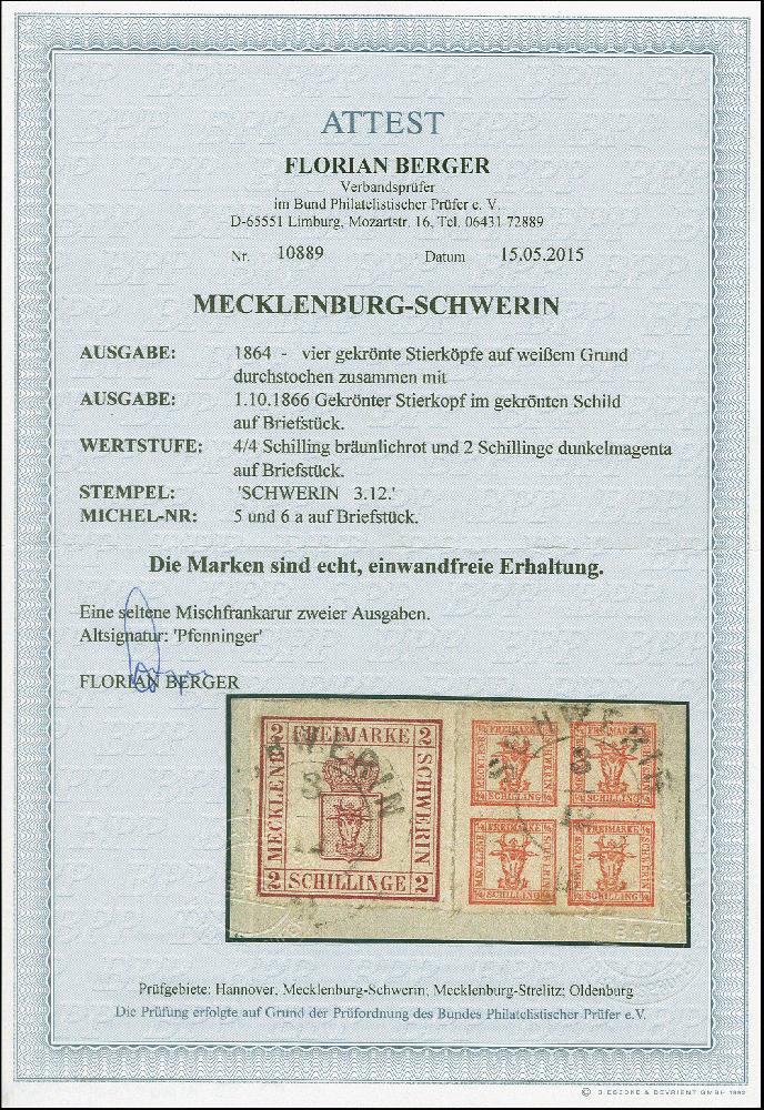 | Zusatzinformationen und Suchstichworte: | 382. Auktion Heinrich Köhler 18. – 23. September 2023 Los 4032 1864,2 Sch. dunkelmagenta, in Mischfrankatur mit 4/4 Sch. bräunlichrot, mit leicht aufgesetztem DKr. "SCHWERIN 3/12" auf Briefstück. Eine seltene Frankaturkombination in einwandfreier Erhaltung. Signiert Pfenninger und Fotoattest Berger BPP (2050) Ausruf 150,00 EUR |