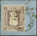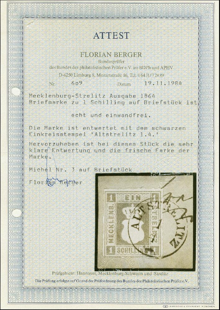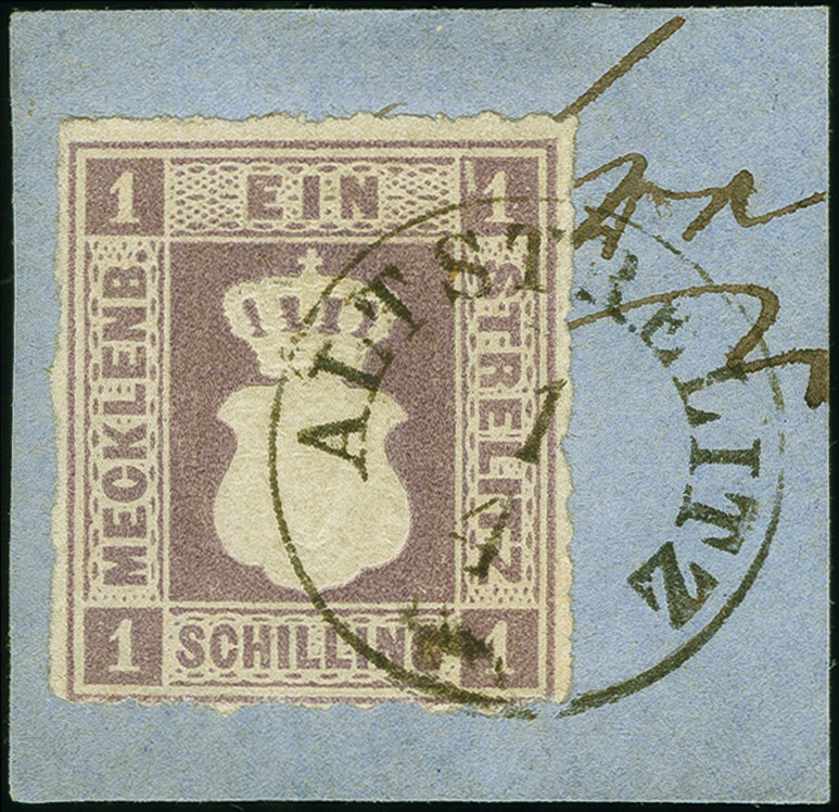| Zusatzinformationen und Suchstichworte: | 382. Auktion Heinrich Köhler 18. – 23. September 2023 Los 4034 1864, 1 Sch. grauviolett, sehr schön farbfrisch und gut durchstochen, sauber mit glasklarem EKr. "ALTSTRELITZ 1 4" auf kleinem Briefstück, in tadelloser Erhaltung und besonders attraktiv, in dieser Erhaltung eine der seltensten Marken Altdeutschlands, Fotoattest Berger BPP (1984) Ausruf 1.000,00 EUR |