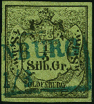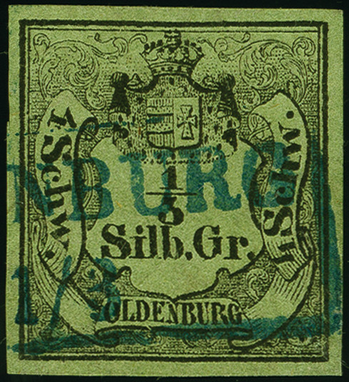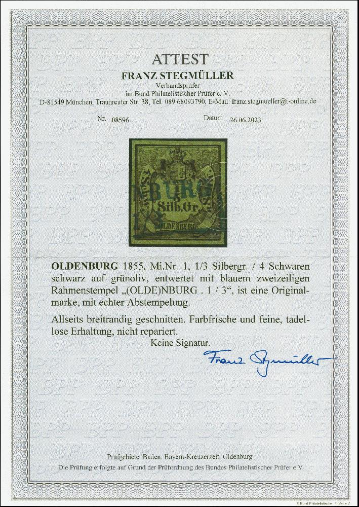 | Zusatzinformationen und Suchstichworte: | 382. Auktion Heinrich Köhler 18. – 23. September 2023 Los 4035 1/3 Gr. auf grün, farbfrisch und allseits breitrandig, sauber mit Ra2 "(OLDE)NBURG 1/3" entwertet, tadellos, Fotoattest Stegmüller BPP (2023) Ausruf 250,00 EUR |