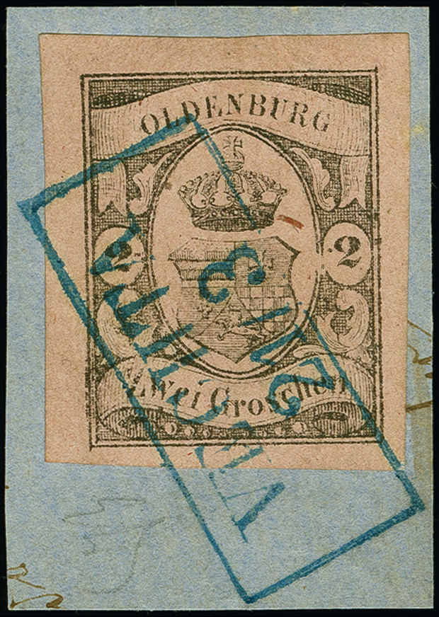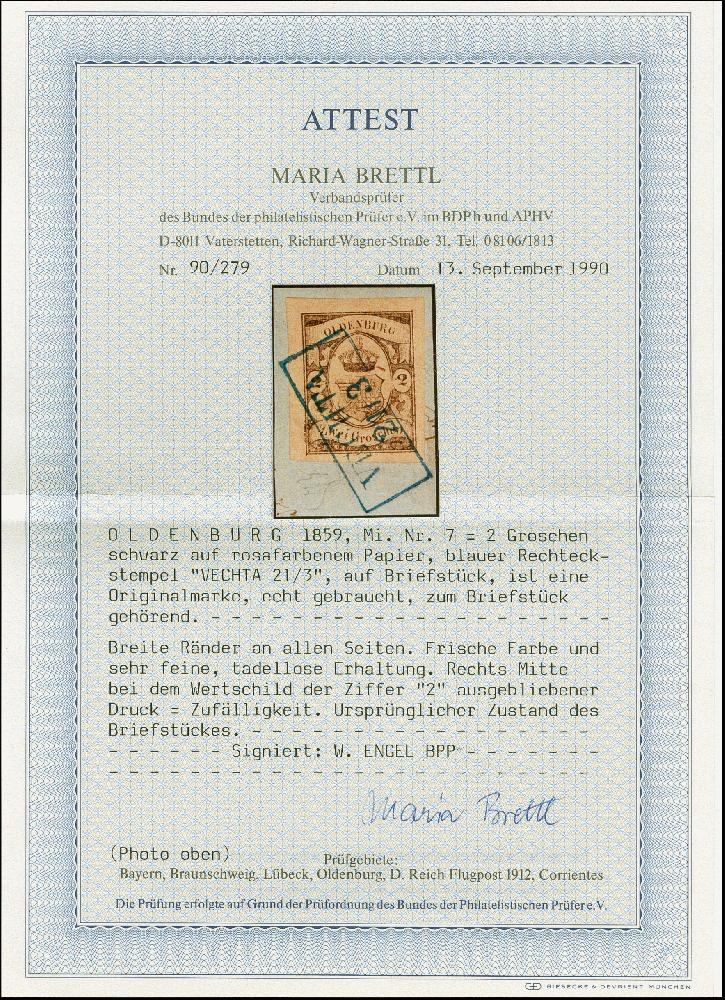 | Zusatzinformationen und Suchstichworte: | 382. Auktion Heinrich Köhler 18. – 23. September 2023 Los 4040 2 Gr. a. graurot, sehr schön farbfrisch und allseits sehr breitrandig, mit klar aufgesetztem Ra.2 "VECHTA 21/3" auf Briefstück. Tadellos. Signiert W. Engel BPP und Fotoattest Brettl BPP (1990) Ausruf 200,00 EUR |