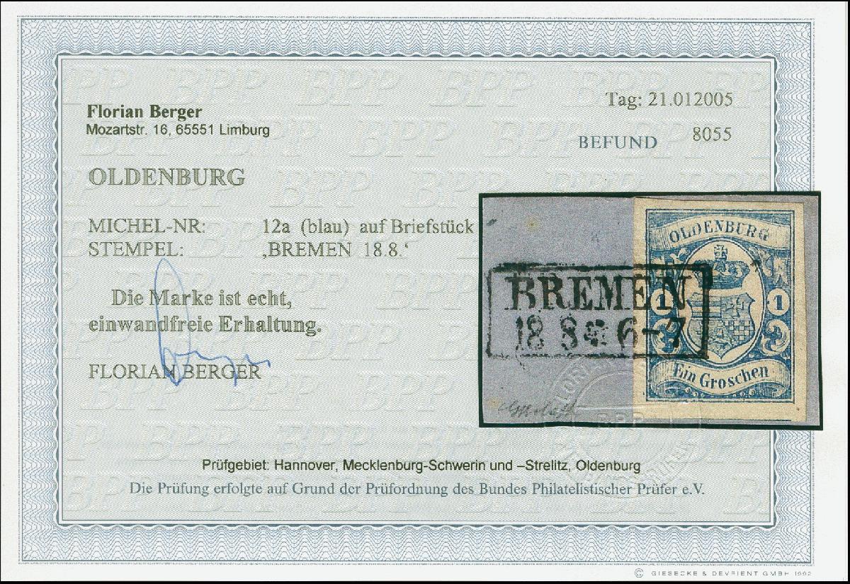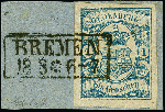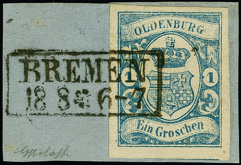 | Zusatzinformationen und Suchstichworte: | 382. Auktion Heinrich Köhler 18. – 23. September 2023 Los 4048 1861, 1 Gr. blau, farbfrisch und allseits breitrandig geschnitten, unten mit kleinem Teil der Nachbarmarke, sauber mit Ra2 "BREMEN 18 8 * 6-7" auf Briefstück, tadellos, sign. A. Bolaffi, G. Bolaffi sowie Brettl BPP und Befund Berger BPP (2005) Ausruf 80,00 EUR |