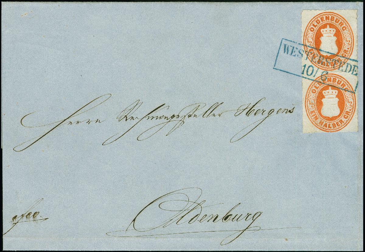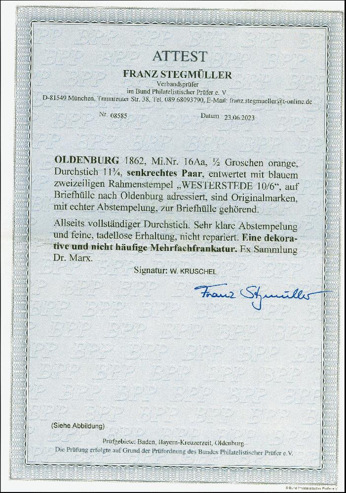 | Zusatzinformationen und Suchstichworte: | 382. Auktion Heinrich Köhler 18. – 23. September 2023 Los 4053 1862, Prägedruckausgabe ½ Gr. orange im senkrechten Paar, farbfrisch und gut durchstochen, mit klarem Ra2 "WESTERSTEDE 10/6" auf Faltbriefhülle nach Oldenburg, tadellos, eine attraktive und nicht häufige Mehrfachfrankatur, sign. Kruschel und Fotoattest Stegmüller BPP (2023) Ausruf 120,00 EUR |