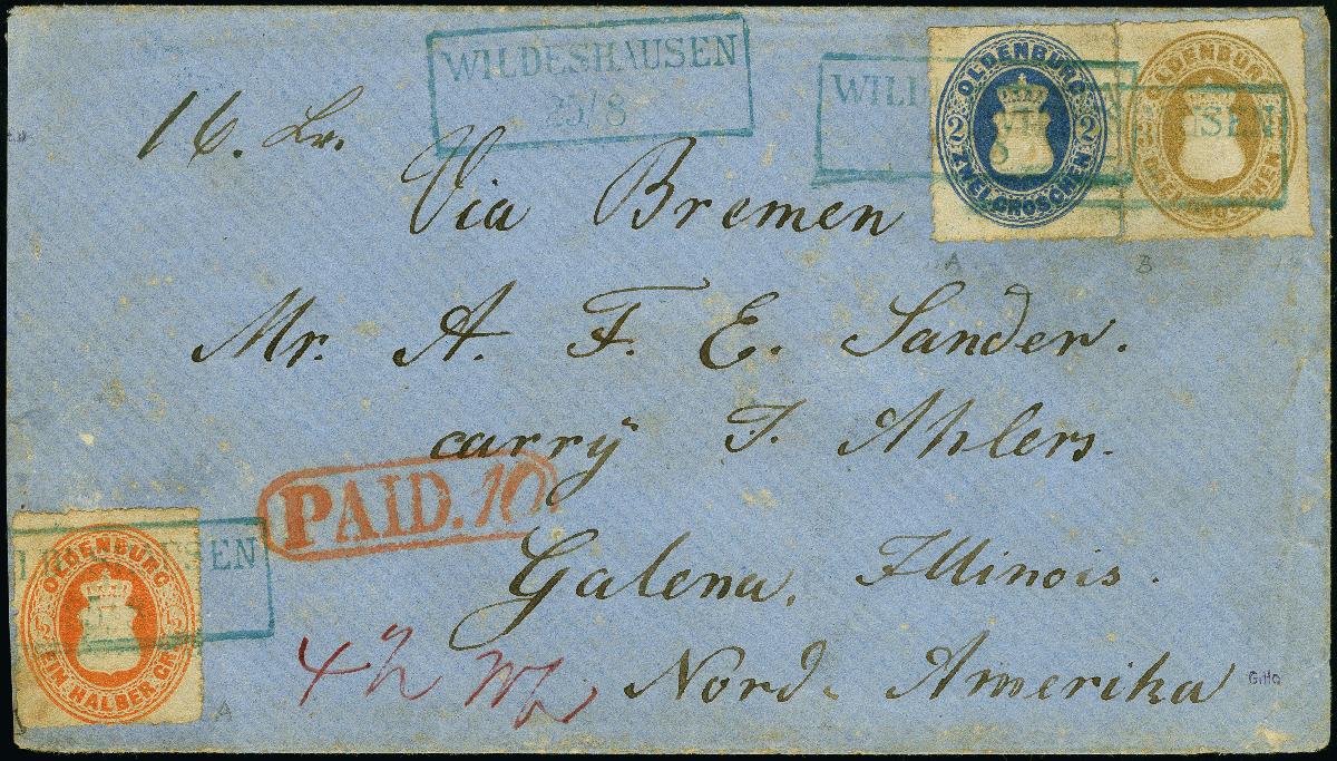 | Zusatzinformationen und Suchstichworte: | 382. Auktion Heinrich Köhler 18. – 23. September 2023 Los 4055 Durchstich 10: 3 Gr. braun, zusammen mit Durchstich 11¾, ½ Gr. orange und 2 Gr. ultramarin, mit Ra2 "WILDESHAUSEN 25/8"(1867) auf Briefkuvert mit rotem Ra. "PAID 10" nach lllinois/USA. Die ½ Gr. leicht fehlerhaft, sonst bis auf etwas Patina einwandfrei. Ein attraktiver Transatlantik-Brief der bekannten Sander-Korrespondenz. Fotoattest Stegmüller BPP (2023) Ausruf 1.500,00 EUR |