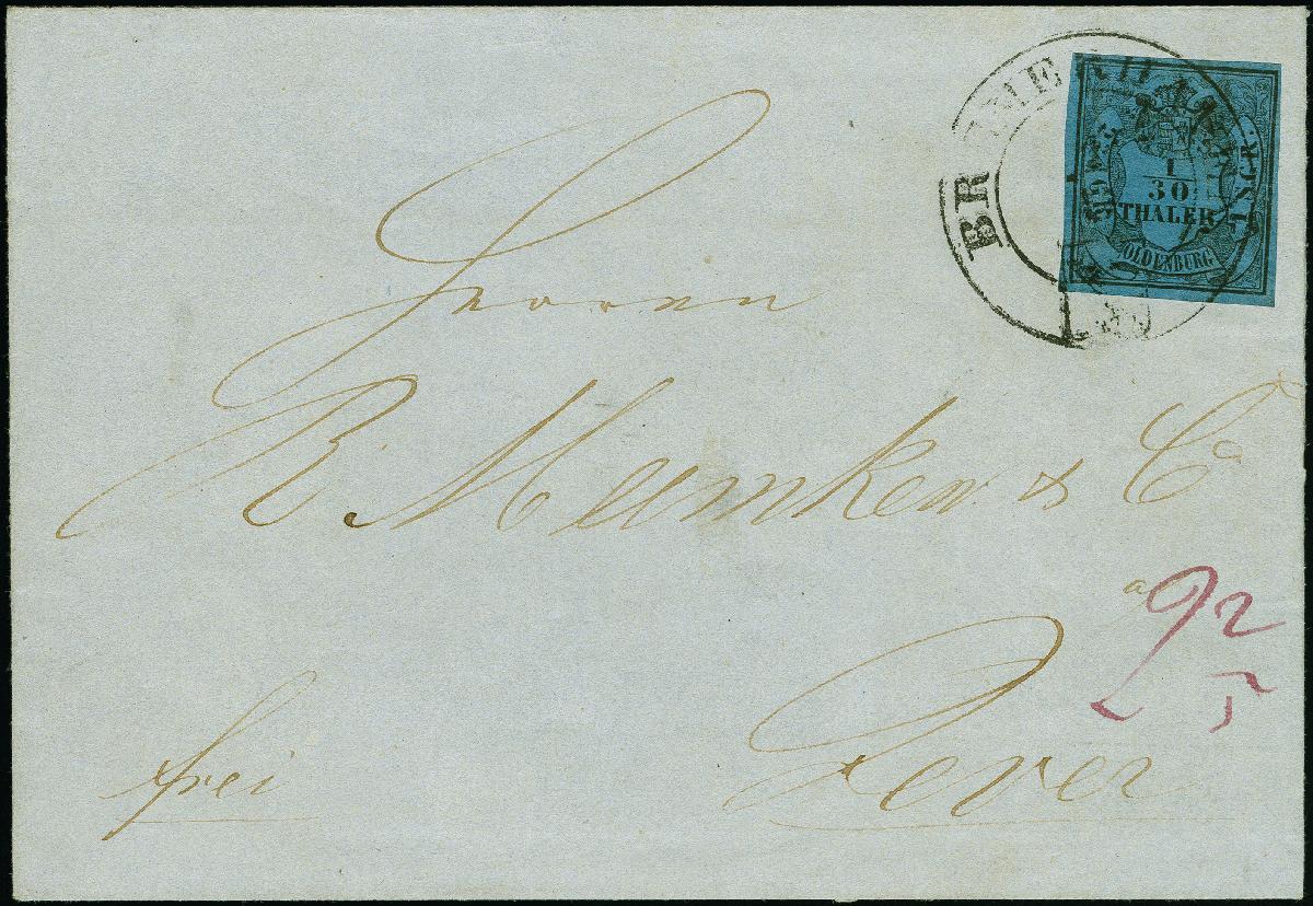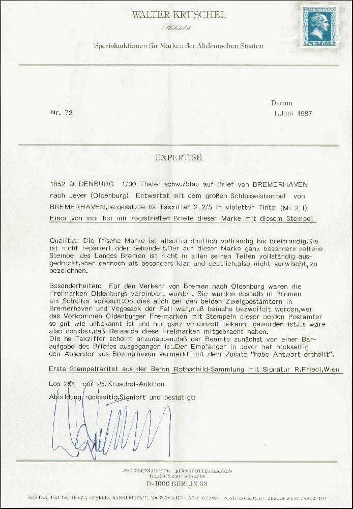 | Zusatzinformationen und Suchstichworte: | 382. Auktion Heinrich Köhler 18. – 23. September 2023 Los 9054 1852, 1/30 Thaler schwarz auf blau, Type IV, voll- bis breitrandig, mit sauber aufgesetztem großen Schlüsselstempel "BREMERHAVEN 1/…" auf Briefhülle nach Jever mit handschriftlichem Taxvermerk "2 2/5". Ein ausgesprochen attraktiver und sehr seltener Brief, es sind nur wenige Briefe der 1.Ausgabe mit dem Schlüsselstempel als Entwerteter registriert. Signiert Friedl, Wien, Kruschel und Dr. Marx, Fotoattest Stegmüller BPP (2023) Ausruf 1.500,00 EUR |