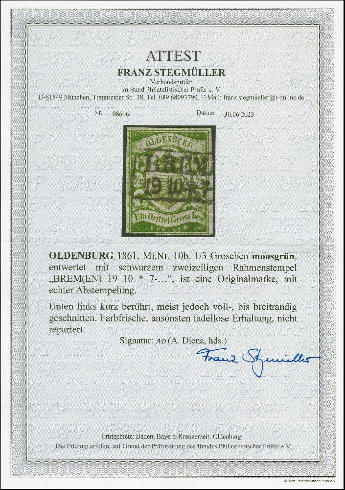 | Zusatzinformationen und Suchstichworte: | 382. Auktion Heinrich Köhler 18. – 23. September 2023 Los 9055 ⅓ Groschen moosgrün, schöne frische Farbe, links unten minimal berührt, sonst voll- bis breitrandig und einwandfrei, sauber entwertet durch Rahmenstempel "BREMEN 19 10". Signiert Alberto Diena, Fotoattest Stegmüller BPP (2023) Ausruf 400,00 EUR |