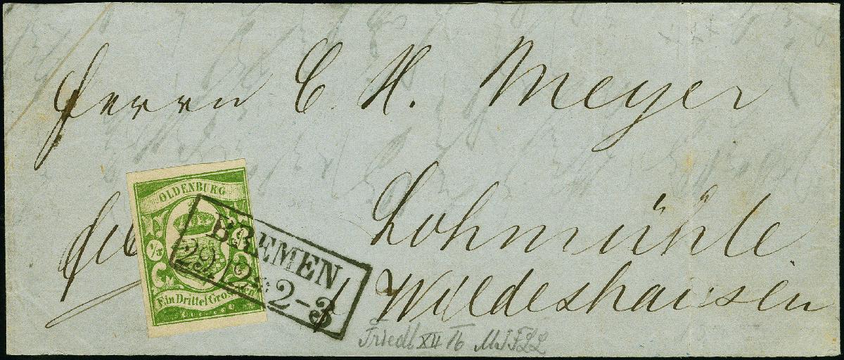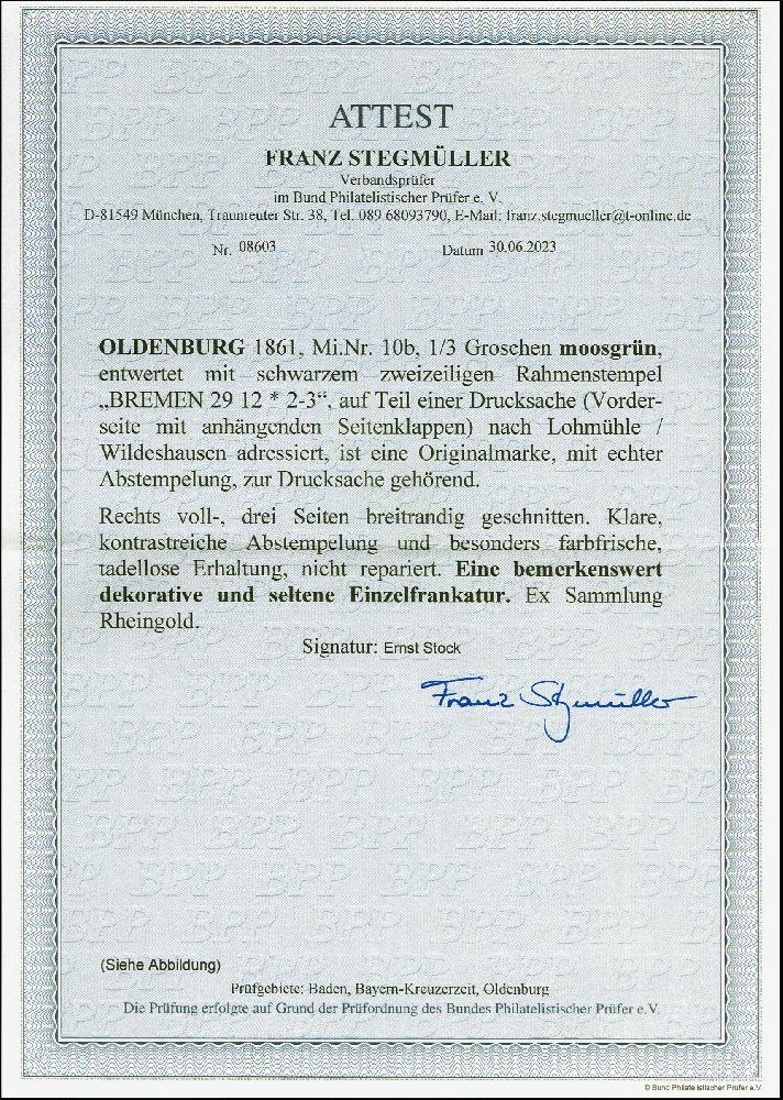 | Zusatzinformationen und Suchstichworte: | 382. Auktion Heinrich Köhler 18. – 23. September 2023 Los 9057 ⅓ Groschen moosgrün in schöner frischer Farbe, rechts voll-sonst breitrandig, mit sauber aufgesetztem Rahmenstempel "BREMEN 29 12" auf Ganzstück an die Lohmühle in Wildeshausen. Sehr schöne frische und einwandfreie Erhaltung. Laut Fotoattest Stegmüller BPP (2023) handelt es sich um den Teil einer Drucksache mit Seitenklappen, unserer Meinung nach (aufgrund der Beschriftung und der Platzierung der Marke) um ein vollständiges Streifband, gefertigt aus bedruckten Papierresten. In jedem Fall ein äußerst attraktives und seltenes Stück. Wir haben kein weiteres Ganzstück mit der seltenen Farbe aus Bremen registriert. Signiert Ernst Stock. Ausruf 8.000,00 EUR |