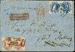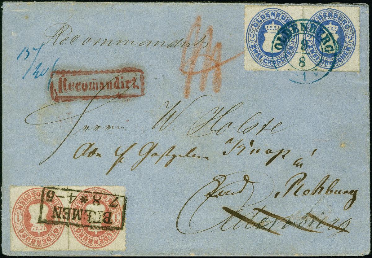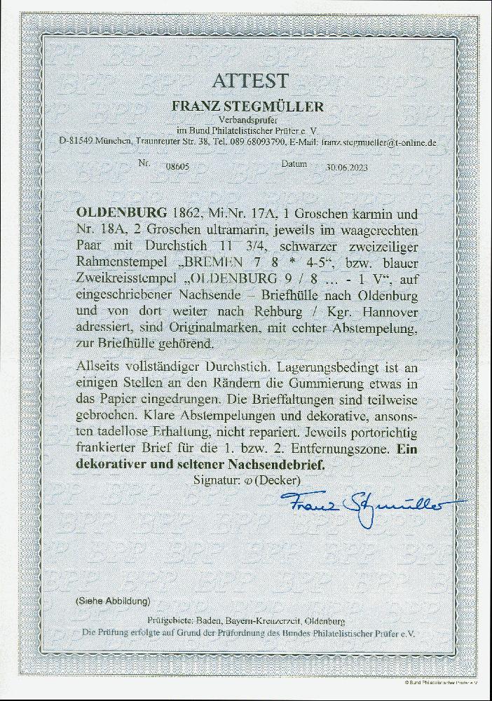| Zusatzinformationen und Suchstichworte: | 382. Auktion Heinrich Köhler 18. – 23. September 2023 Los 9058 1862, 1 Groschen karmin im waagerechten Paar, mit sauber aufgesetztem Rahmenstempel "BREMEN 7 8" auf recommandirter Briefhülle nach Oldenburg, hier neu aufgegeben, frankiert mit waagerechtem Paar 2 Groschen ultramarin, mit sauber aufgesetztem Doppelkreisstempel "OLDENBURG 9/8", und nachgesandt nach Rehburg in Hannover. Der Brief ist für beide Strecken jeweils portogerecht frankiert. Minimale Lagerungsspuren und die Briefhülle in den Faltungen teilweise gebrochen, sonst einwandfrei. Ein ganz ungewöhnlicher und attraktiver Brief. Signiert Decker und Fotoattest Stegmüller BPP (2023) Ausruf 800,00 EUR |