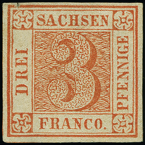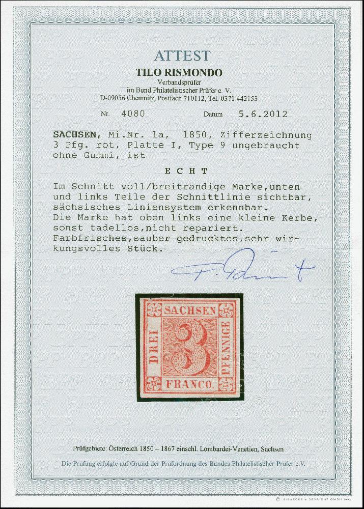 | Zusatzinformationen und Suchstichworte: | 382. Auktion Heinrich Köhler 18. – 23. September 2023 Los 4086 3 Pfg. rot, Platte I, Type 9, sehr schön farbfrisch und voll- bis meist breitrandig, mit schöner Prägung, ungebraucht ohne Gummi. Links oben ganz kleine Randspalt, sonst einwandfrei. Ein attraktives und seltenes Stück. Fotoattest Rismondo BPP (2012) Ausruf 1.500,00 EUR |