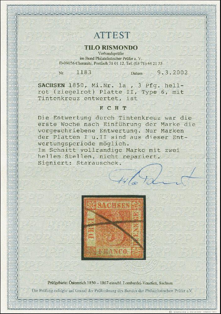 | Zusatzinformationen und Suchstichworte: | 382. Auktion Heinrich Köhler 18. – 23. September 2023 Los 4087 3 Pfg. ziegelrot, Platte II, Type 6, farbfrisch und allseits vollrandig, sehr schöner Prägedruck, mit der in der 1. Woche vorgeschriebenen Entwertung durch Federkreuz. Rückseitig zwei aufgerauhte Stellen, sonst einwandfrei. Ein seltenes Stück. Signiert Starauschek und Brandes, Fotoattest Rismondo BPP (2002) Ausruf 1.500,00 EUR |