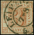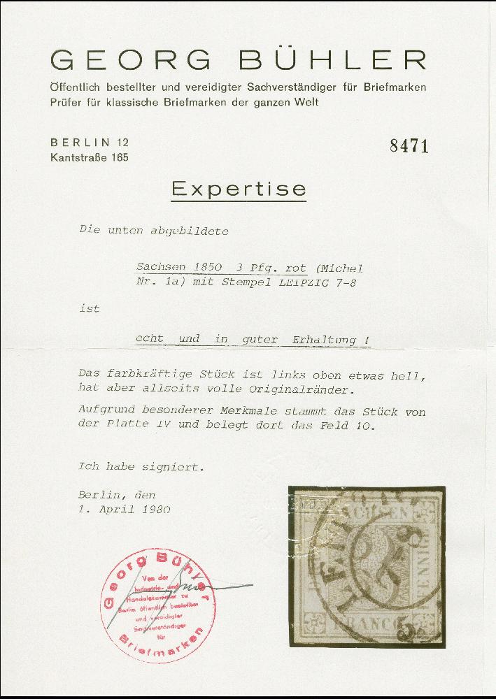 | Zusatzinformationen und Suchstichworte: | 382. Auktion Heinrich Köhler 18. – 23. September 2023 Los 4091 3 Pfg. Lebhaft rot, Platte IV, Typ 10, sehr tiefe Farbe und allseits voll-bis meist breitrandig, oben und unten mit Teilen der Trennungslinien, sauber entwertet durch DKr. "LEIPZIG 5...". Die Marke ist oben etwas hell, links oben kleine Eckbug, sonst einwandfrei. Fotoatteste Georg Bühler (1980) und Vaatz BPP (2023) Ausruf 1.000,00 EUR |