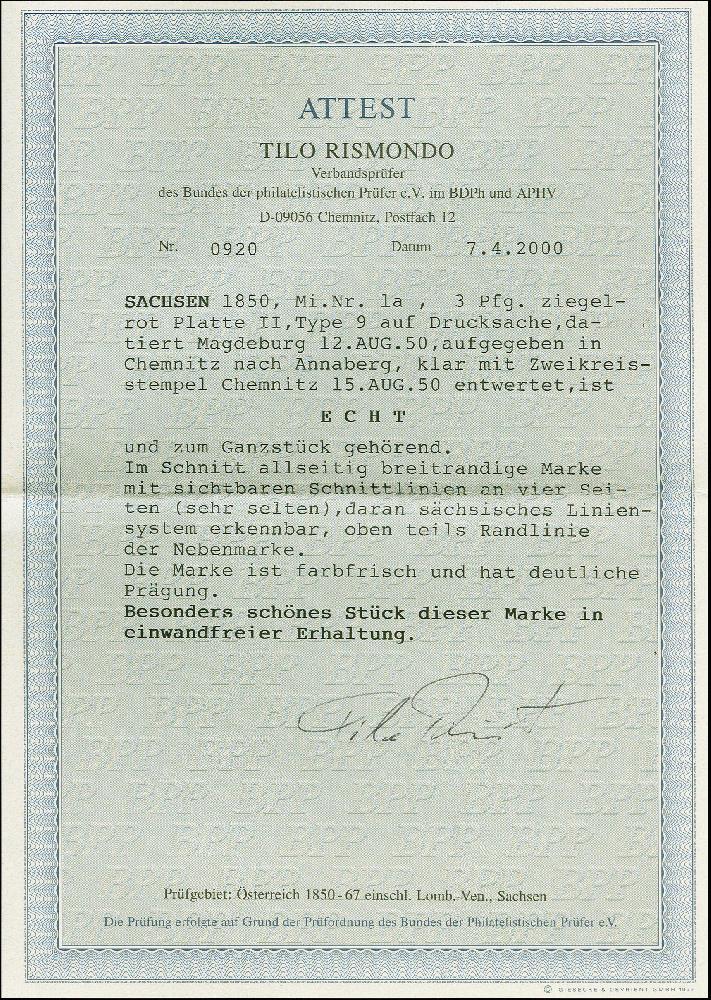 | Prüfer: | Rismondo, Tilo (BPP (Bund Philatelistischer Prüfer)) |