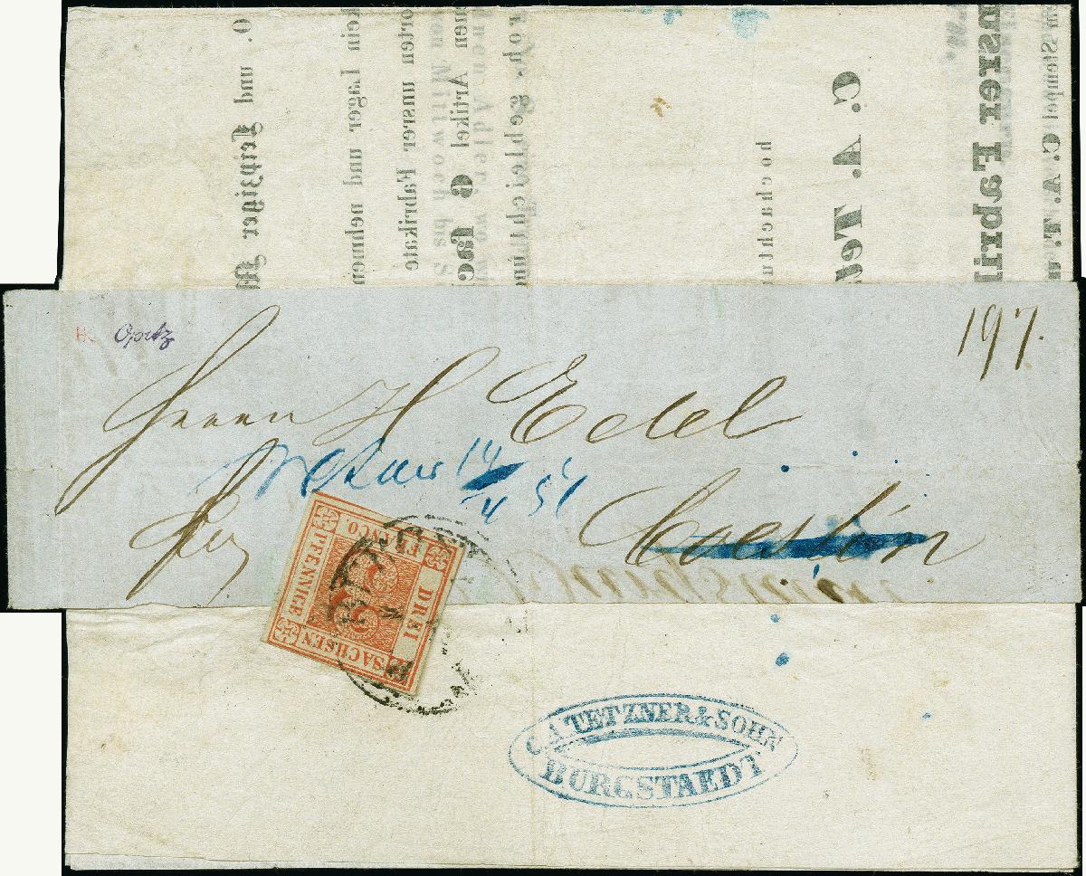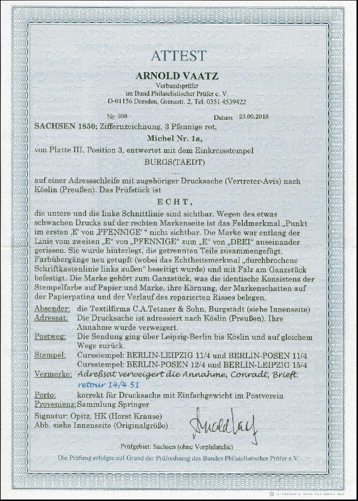| Zusatzinformationen und Suchstichworte: | 382. Auktion Heinrich Köhler 18. – 23. September 2023 Los 4094 3 Pfennig rot, Platte III, Type 3, oben voll-, sonst allseits breitrandig mit Teilen der Zwischenlinien links und unten, mit Einkreisstempel von Burgstädt, übergehend geklebt auf Streifband, mit Originalinhalt, nach Coeslin und "retour 14/4 51" mit rückseitigem Vermerk "Adressat verweigert die Annahme", sowie Bahnpoststempeln "BERLIN-LEIPZIG" und "BERLIN-POSEN". Die Marke war bei Öffnung des Streifbandes zerrissen und wurde kunstvoll wieder zusammengefügt. Eine attraktive Drucksache mit auf der Nr. 1 seltenen Entwertung. Signiert HK und Opitz, Fotoattest Vaatz BPP (2018) Ausruf 2.000,00 EUR |