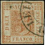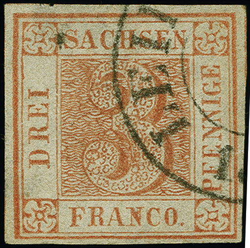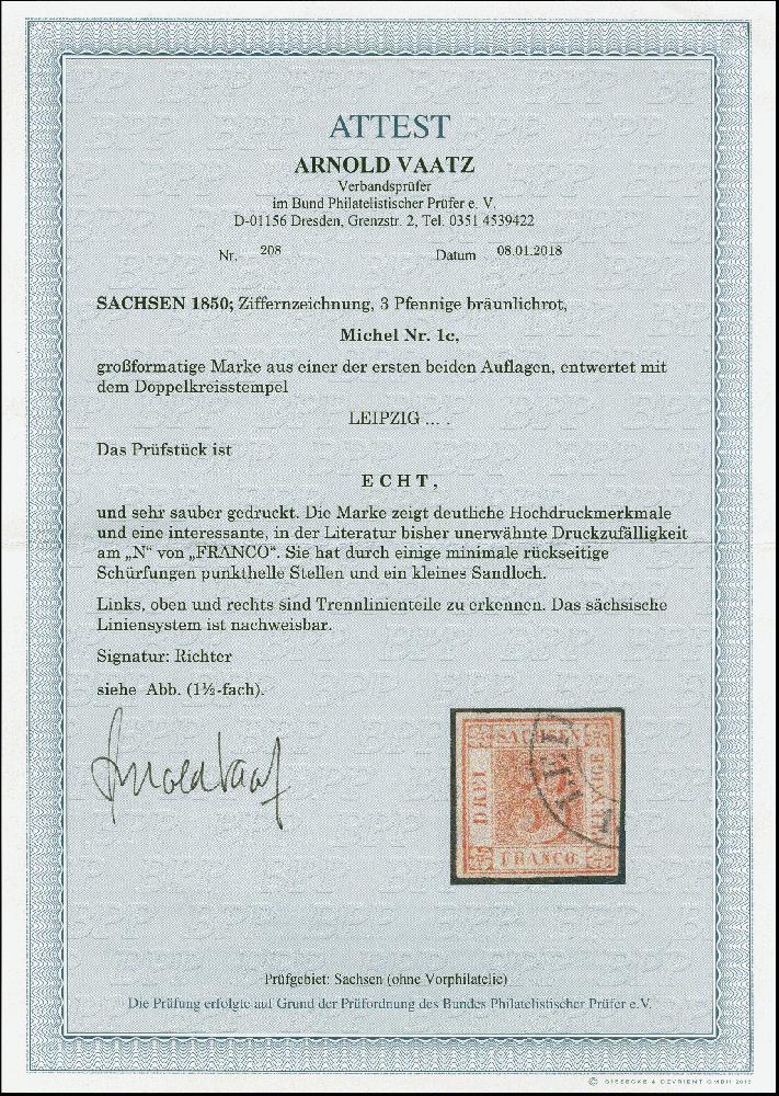 | Zusatzinformationen und Suchstichworte: | 382. Auktion Heinrich Köhler 18. – 23. September 2023 Los 4095 3 Pfg. braunrot, großformatige Marke aus einer der ersten beiden Auflagen mit Druckzufälligkeit am N von FRANCO, farbfrisch und allseits breitrandig, dreiseitig mit Teilen der Zwischenlinien, daran sächsisches Liniensystem nachweisbar, sauber entwertet durch DKr. von Leipzig. Einige punkthelle Stellen durch minimale rückseitige Schürfungen und kleine Sandkornloch, sonst einwandfrei. Ein attraktives Stück der seltenen Farbe. Signiert Richter und Fotoattest Vaatz BPP (2018) Ausruf 2.000,00 EUR |