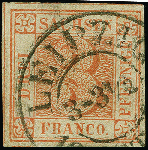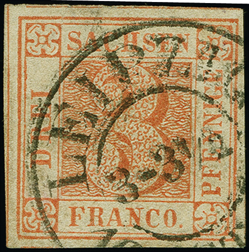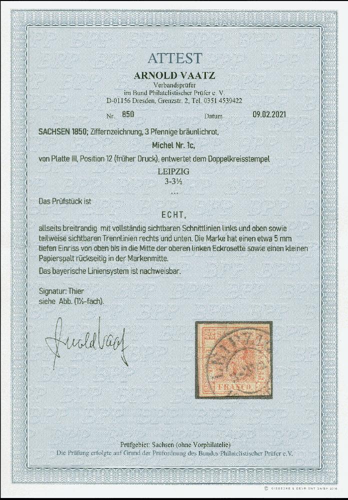 | Zusatzinformationen und Suchstichworte: | 382. Auktion Heinrich Köhler 18. – 23. September 2023 Los 4097 3 Pfg. braunrot, Platte III, Type 12, farbfrisch und allseits breitrandig, oben und links mit vollen Zwischenlinien, daran bayerisches Liniensystem nachweisbar, sauber entwertet durch DKr. von Leipzig. Oben links unauffälliger 5mm langer Einriss und rückseitig kleiner Papierspalt in der Markenmitte, sonst einwandfrei. Ein attraktives Stück der seltenen Farbe. Signiert Thier und Fotoatteste Vaatz BPP (2018 und 2021) Ausruf 1.500,00 EUR |