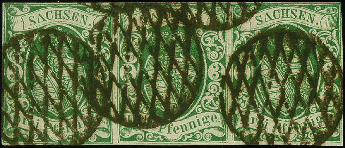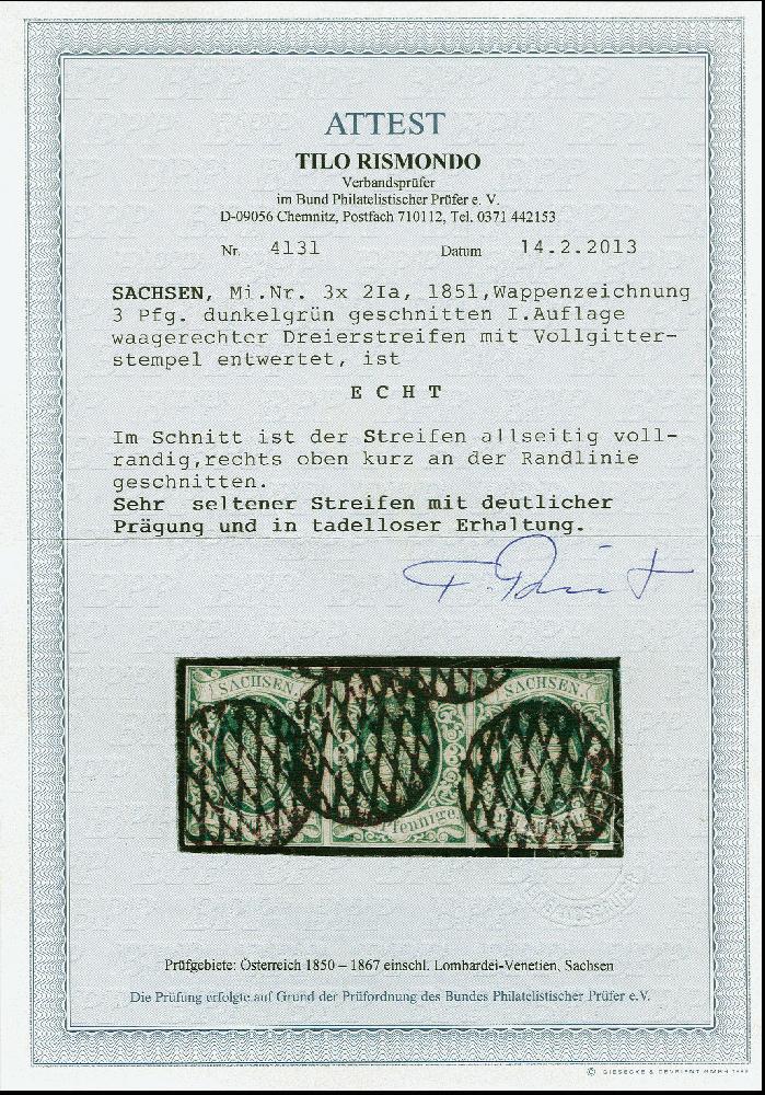| Zusatzinformationen und Suchstichworte: | 382. Auktion Heinrich Köhler 18. – 23. September 2023 Los 4099 1851, I. Auflage 3 Pfg. dunkelgrün in heller Nuance, leuchtend farbfrischer waagerechter Dreierstreifen mit deutlicher Prägung, die rechte Marke rechts oben winzig berührt, sonst allseits vollrandig, sauber mit Vollgitterstempel entwertet, eine, besonders mit diesem Stempel, sehr seltene und attraktive Einheit, sign. Rismondo mit Fotoattest (2013) sowie Fotoattest Vaatz BPP (2018) Ausruf 1.200,00 EUR |
