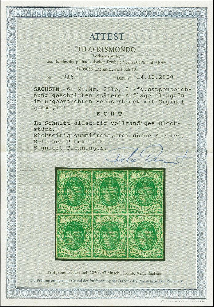 | Zusatzinformationen und Suchstichworte: | 382. Auktion Heinrich Köhler 18. – 23. September 2023 Los 4101 3 Pfg. blaugrün im waagerechten 6er-Block, sehr schön farbfrisch und für diese Ausgabe phantastisch, allseits breitrandig geschnitten, ungebraucht mit frischem Originalgummi, drei kleine dünne Stellen, sonst tadellos, eine sehr attraktive und seltene Einheit, u.a. sign. Pfenninger sowie Fotoattest Rismondo BPP (2000) Ausruf 1.000,00 EUR |