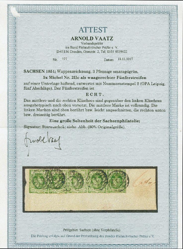 | Zusatzinformationen und Suchstichworte: | 382. Auktion Heinrich Köhler 18. – 23. September 2023 Los 4103 3 Pfg. smaragdgrün im waagerechten 5er-Streifen, sehr schön farbfrisch, ausgabetypisch teils etwas berührt, die mittlere Marke vollrandig, sauber mit Nummernstempel "2" LEIPZIG auf Briefstück (zur Kontrolle ehemals gelöst), eine außerordentlich seltene Einheit in insgesamt schöner Erhaltung, sign. Starauschek mit Attest sowie Fotoattest Vaatz BPP (2018) Ausruf 1.000,00 EUR |