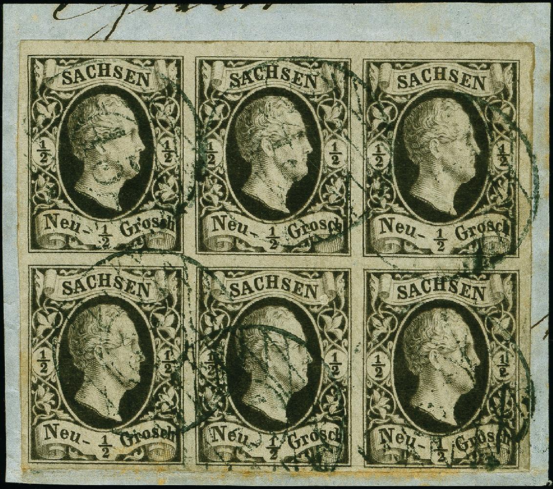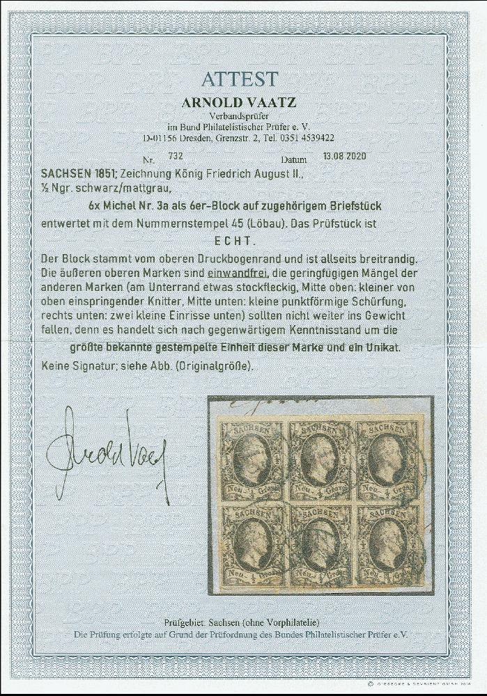 | Zusatzinformationen und Suchstichworte: | 382. Auktion Heinrich Köhler 18. – 23. September 2023 Los 4105 ½ Ngr. auf mattgrau im 6er-Block, farbfrisch und allseits voll- bis breitrandig geschnitten, oben kleiner Ansatz vom Bogenrand, sauber mit Nummer "45" LÖBAU auf Briefstück, die rechte untere Marken mit zwei kleinen Einrissen, sonst teils winzigste Mängel, unten gering Patina. Eine besonders attraktive, sowie die größte bekannte gestempelte Einheit dieser Marke und Unikat, Fotoatteste Rismondo BPP (2002) sowie Vaatz BPP (2020) Ausruf 2.000,00 EUR |