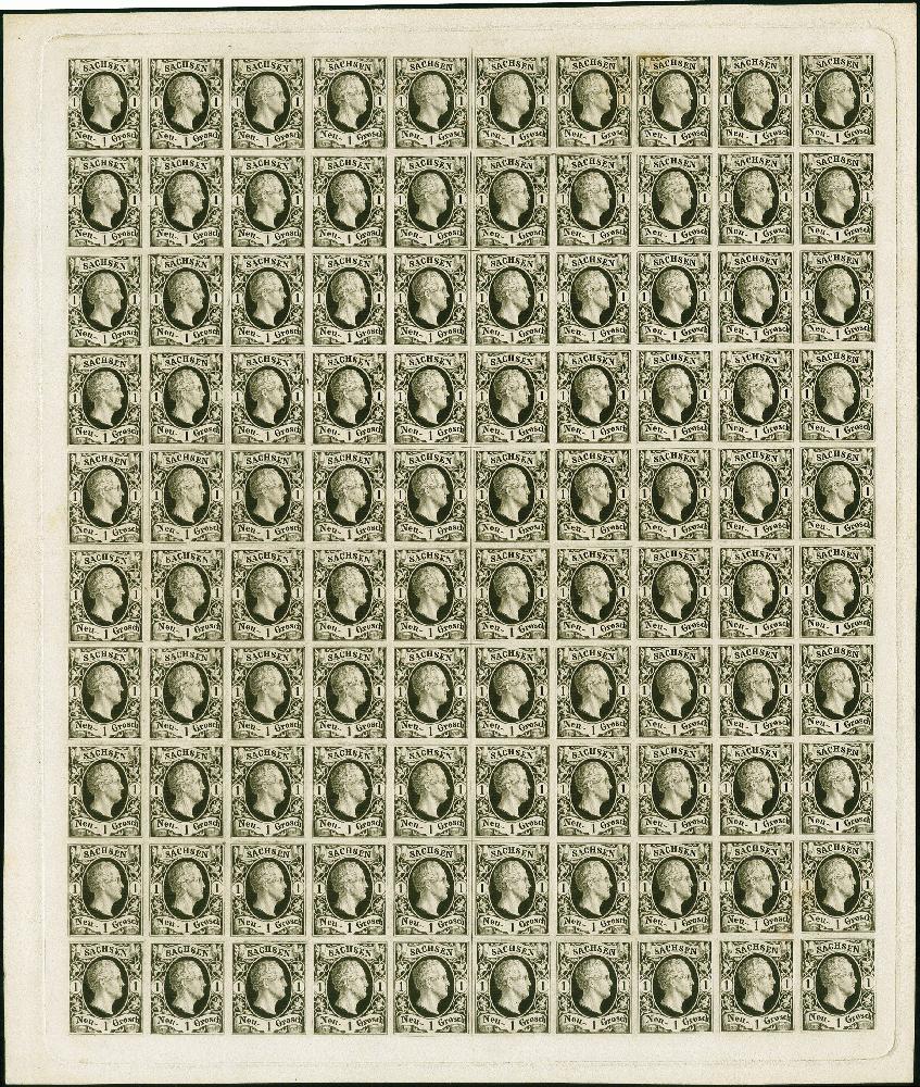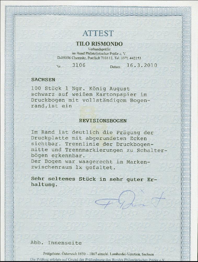 | Zusatzinformationen und Suchstichworte: | 382. Auktion Heinrich Köhler 18. – 23. September 2023 Los 4106 REVISIONSBOGEN: Friedrich August II. 1 Ngr. schwarz auf weißem Kartonpapier, vollständiger Bogen, einmal waagerecht, zwischen den Marken gefaltet. Dabei auf Feld 32 der Plattenfehler "untere Wertziffer 1 mit kurzem Anstrich", auf Feld 60 "eingedrückte Stirn", auf Feld 62 "Komma nach h von Grosch", auf Feld 71 "weißer Ring über linkem Wertschild", auf Feld 86 "rechte untere Bildecke beschädigt", auf Feld 93 "Plattenriss in der linken unteren Markenecke", außerdem auf Feld 94 der ",späte Ringel" der 11. Platte. Fotoatteste Friedl Expert Committee (1955) und Rismondo BPP (2010) Ausruf 500,00 EUR |